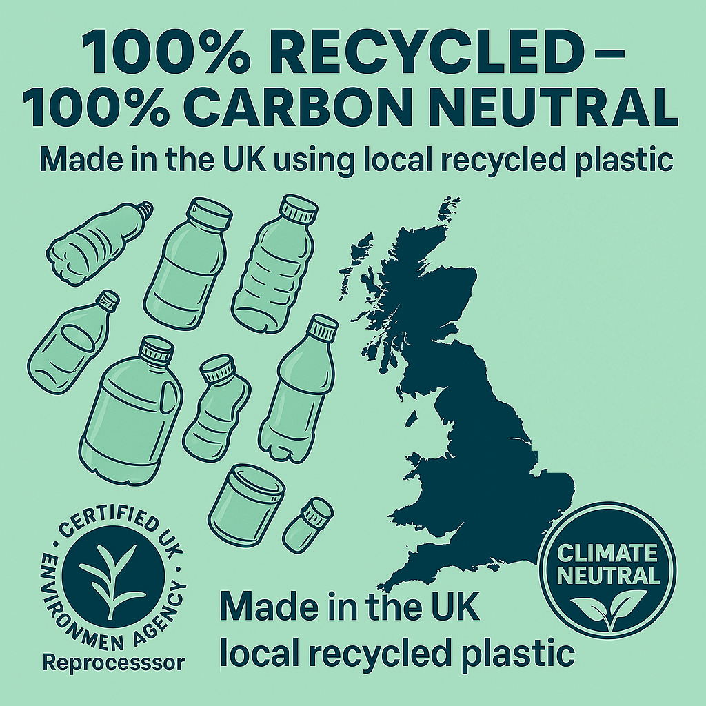 Produced in the UK using local Waste R-plastic, by an EA certified reprocessor.